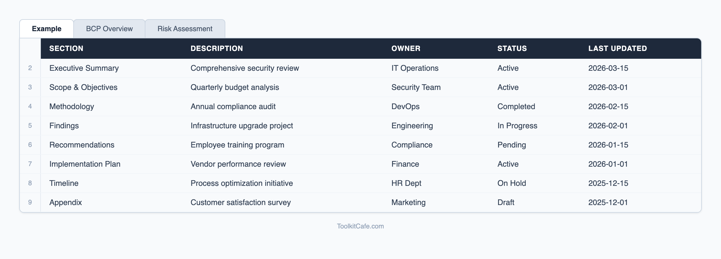 The Business Continuity Planning Kit gives organizations a structured Excel toolkit for preparing against operational disruptions. The workbook covers business impact analysis — identifying critical processes, their recovery time objectives, and dependencies. Recovery strategy worksheets document the specific steps your team takes to restore operations for each critical function.
